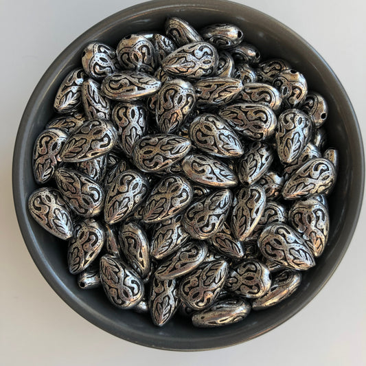 20X Antique Silver Beads 18x12mm Teardop Metallic Acrylic Plastic Bead