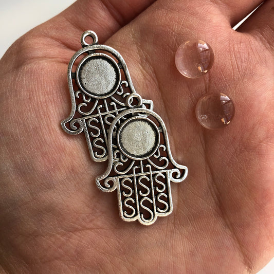 Antique Silver Metal Hand Of Fatima Charm Pendant 36x25mm Hamza Charms 10mm Cabochon Set