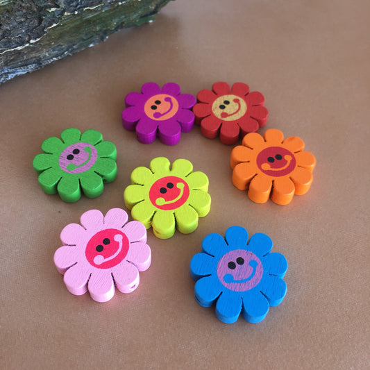 Mixed Wooden Flower Beads 23mm Happy Smiley Floral Wood Bead 25 Pieces