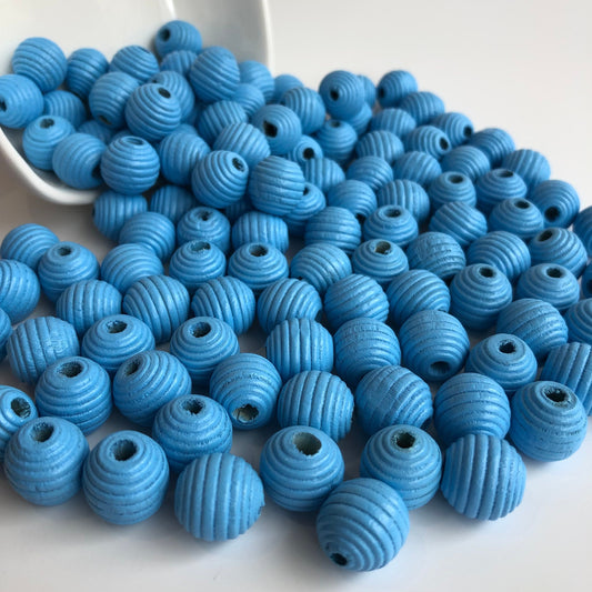 Blue Wood Beads 14mm Round Spiral Bee Hive Wooden Craft Bead 25 Pieces