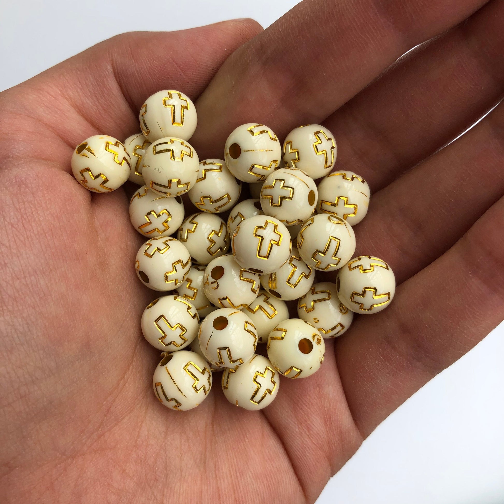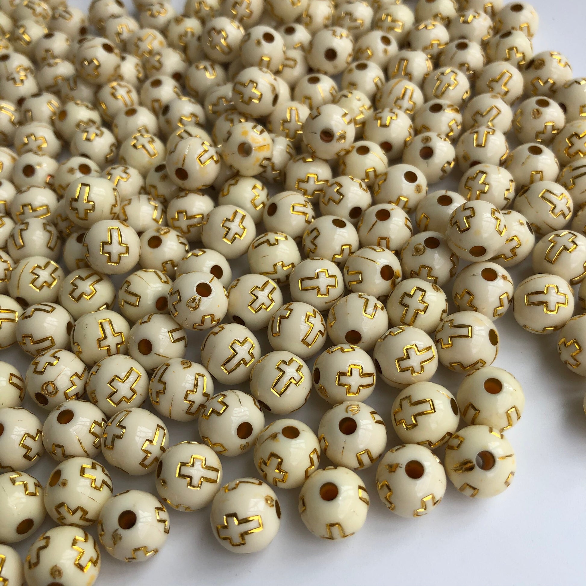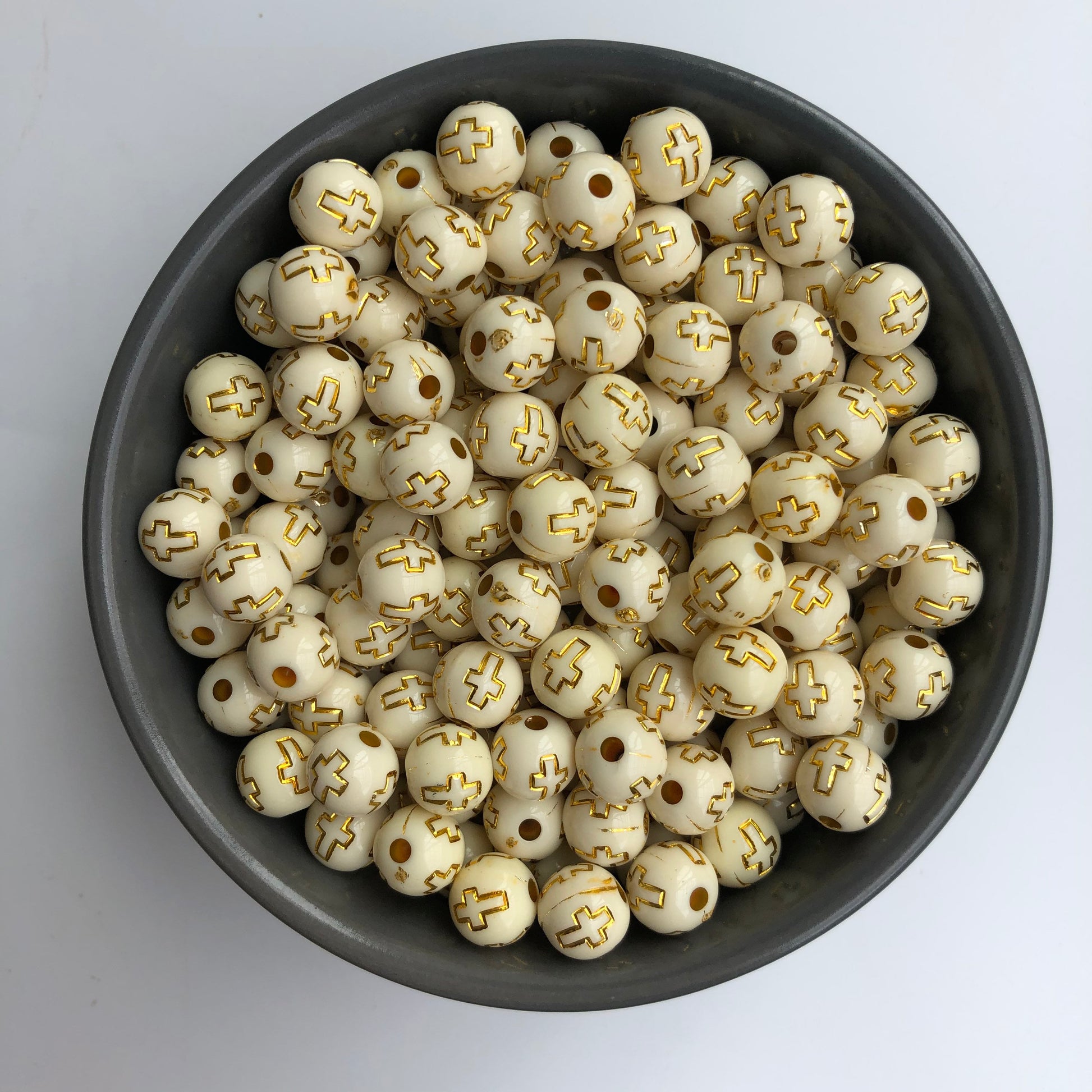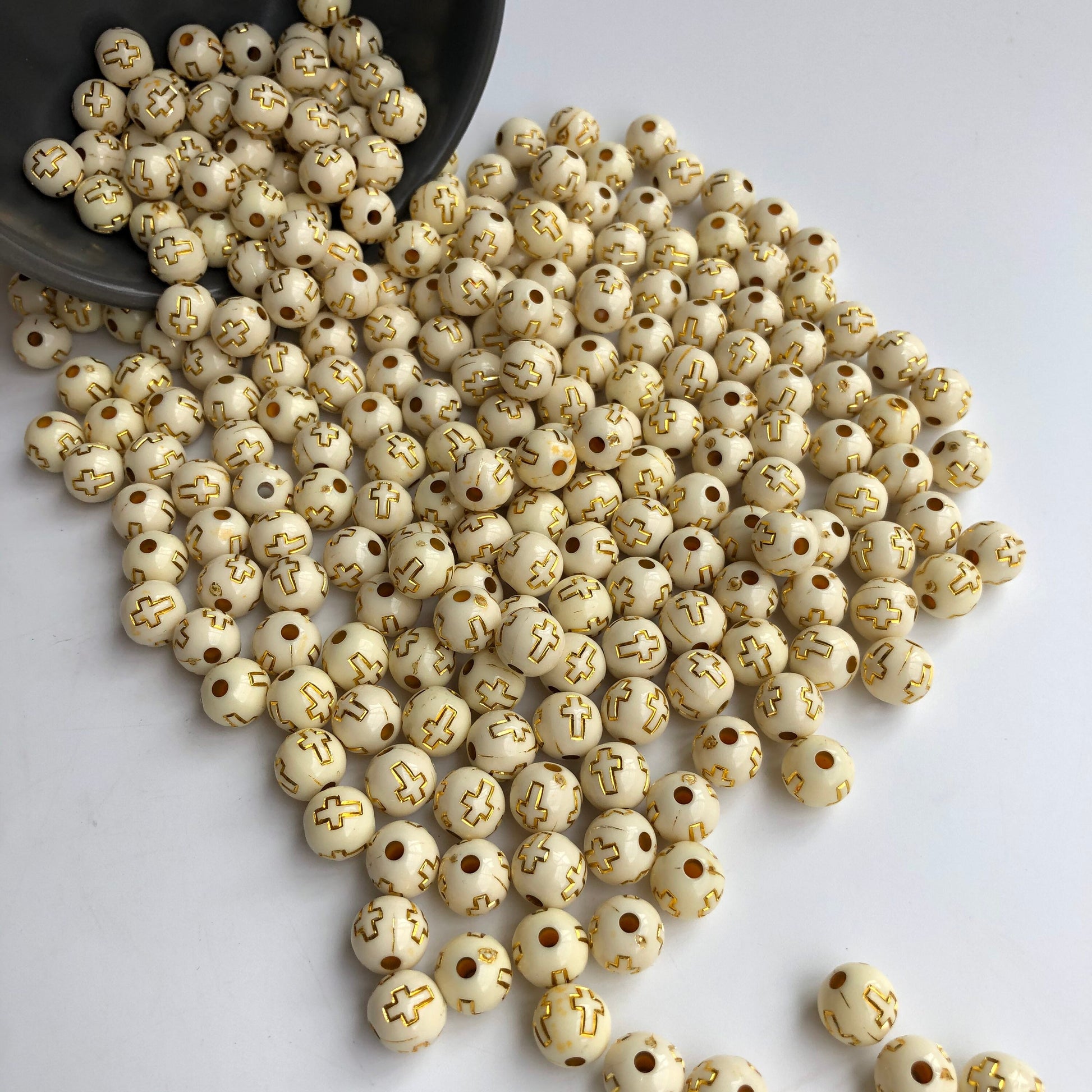 Beige & Gold Cross Beads 10mm Round Jewellery Making Plastic Bead 50 Pieces