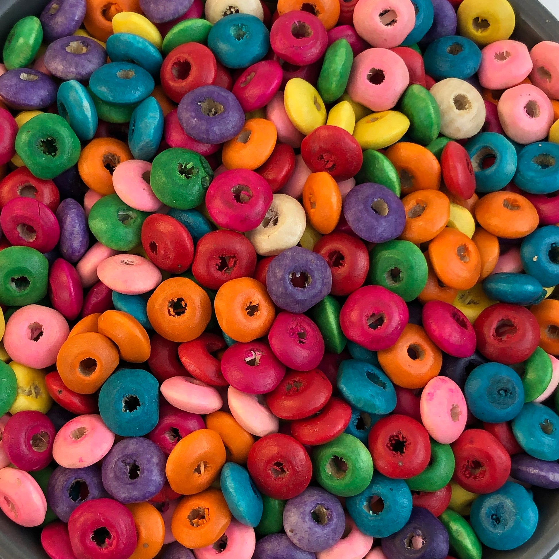 Dyed multi coloured saucer beads, great for necklace and bracelet making projects and can even be be strung together and be used as decoration.