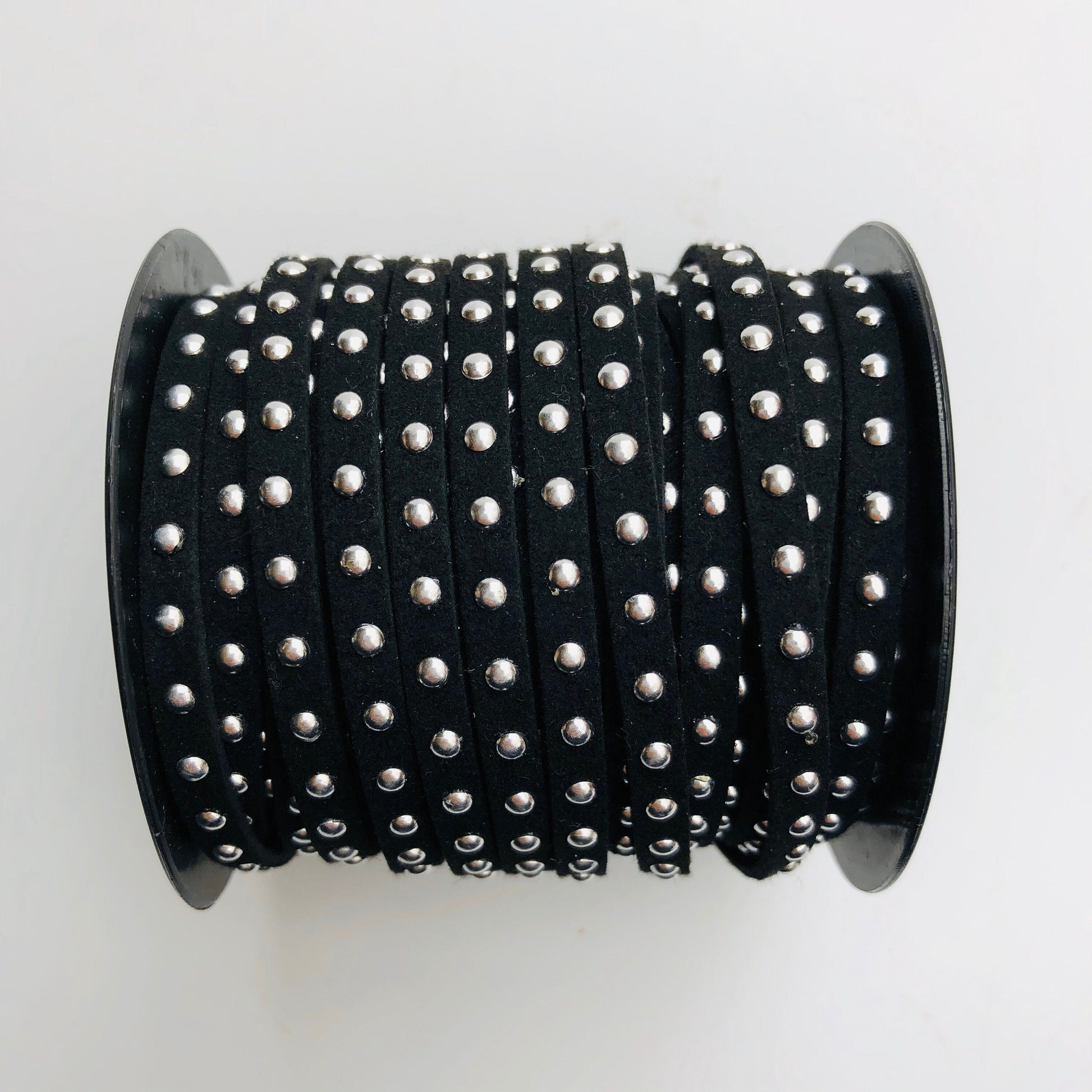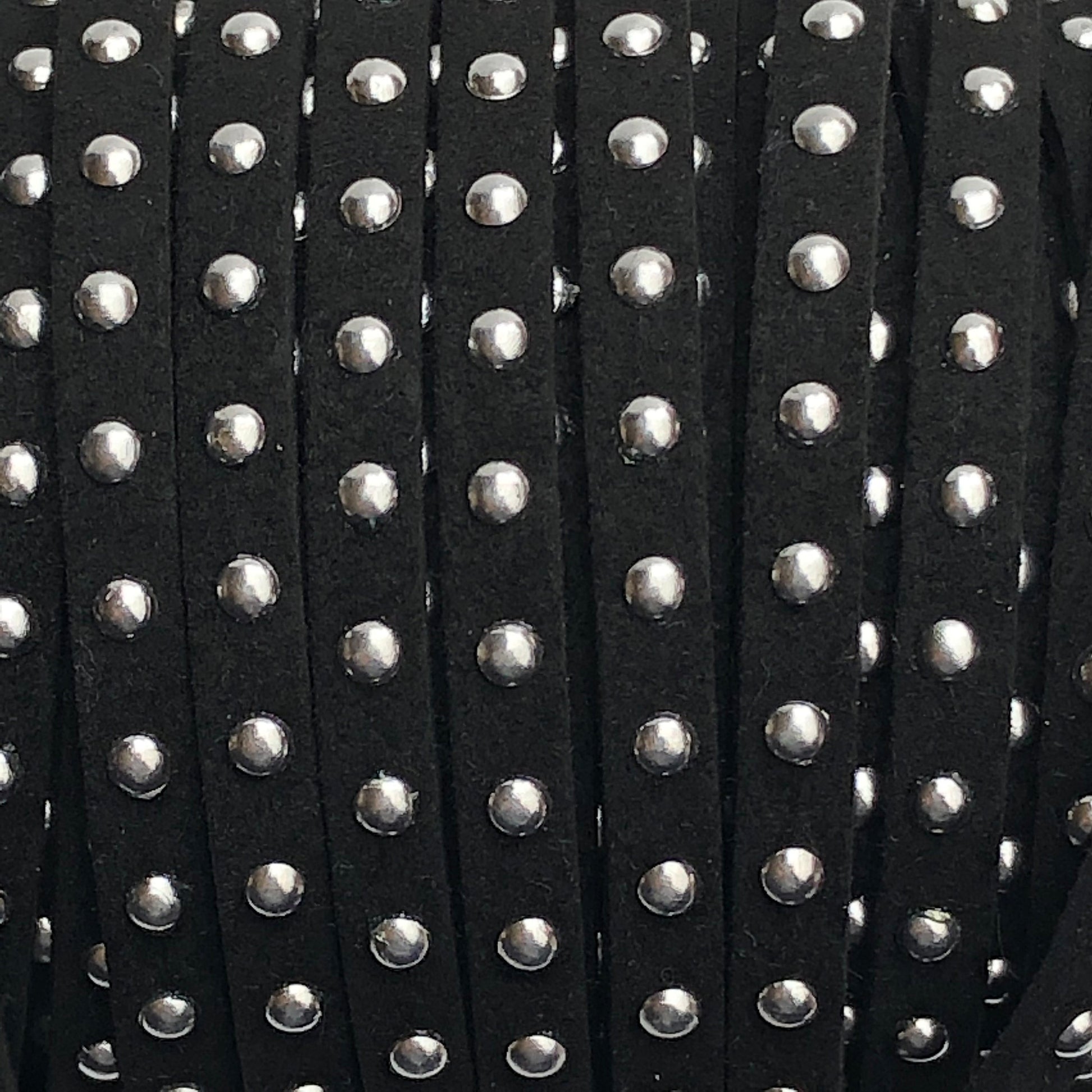 Black Faux Suede Lace with Silver Studs 5mm Thich Flat Cord 1 Meter Long