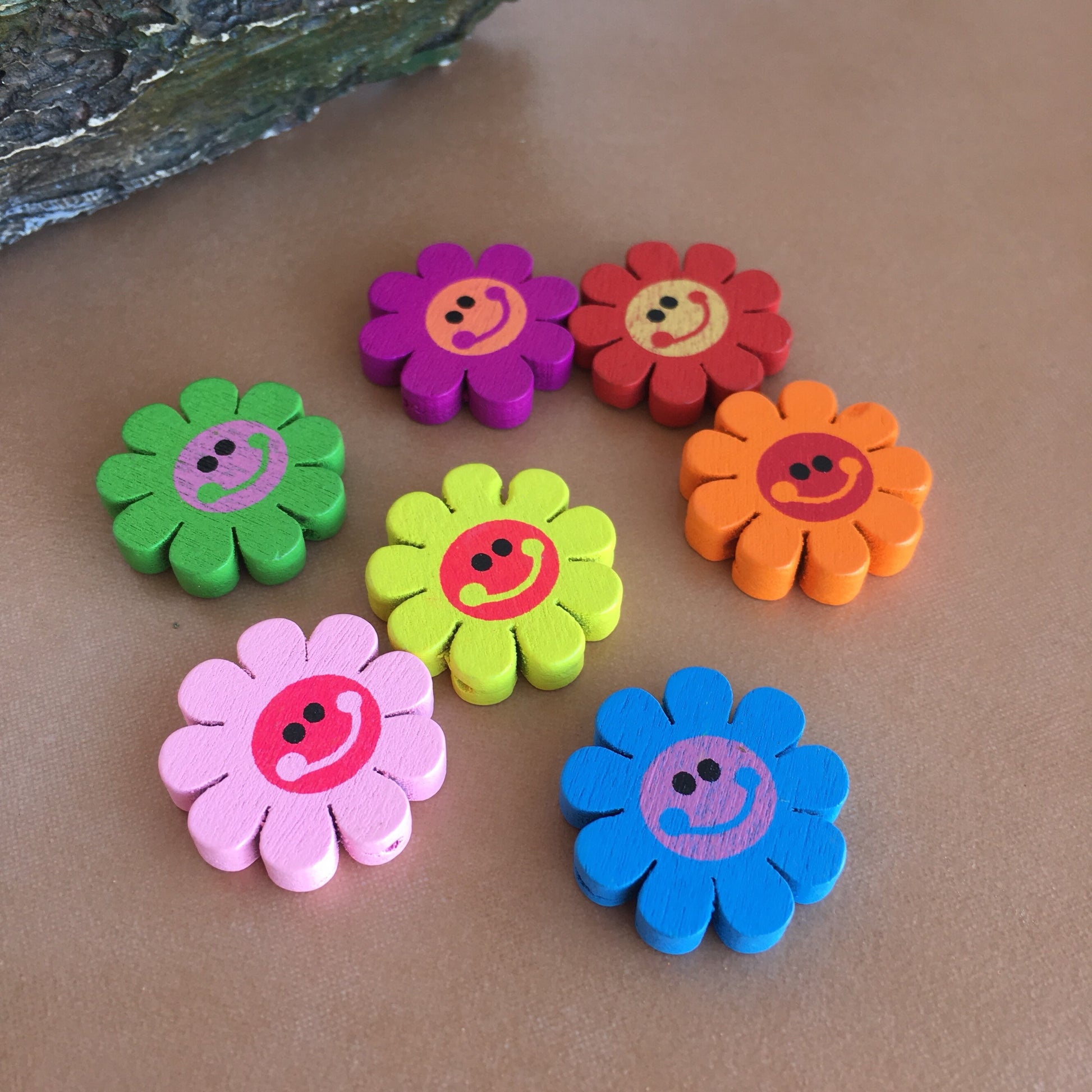 Mixed Wooden Flower Beads 23mm Happy Smiley Floral Wood Bead 25 Pieces