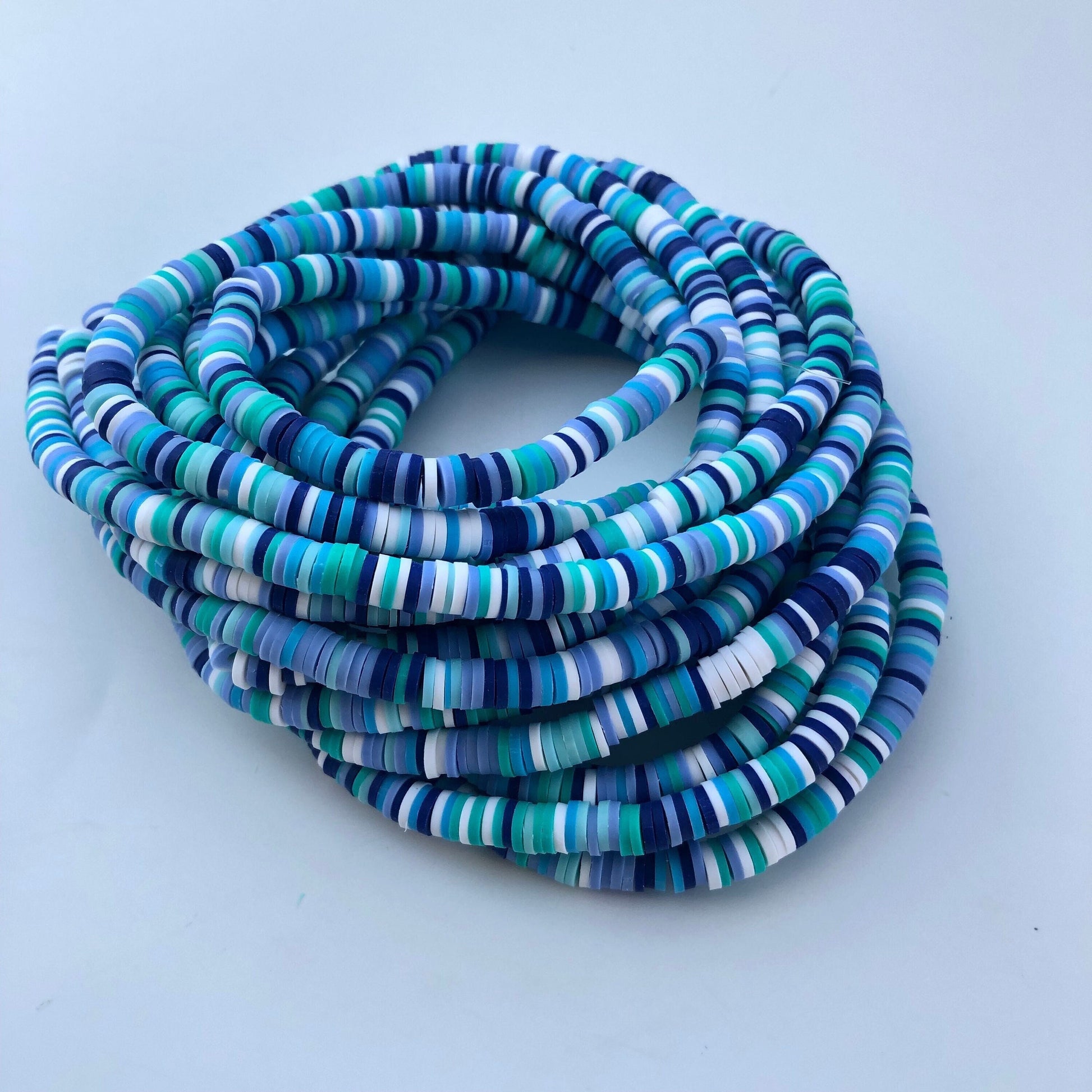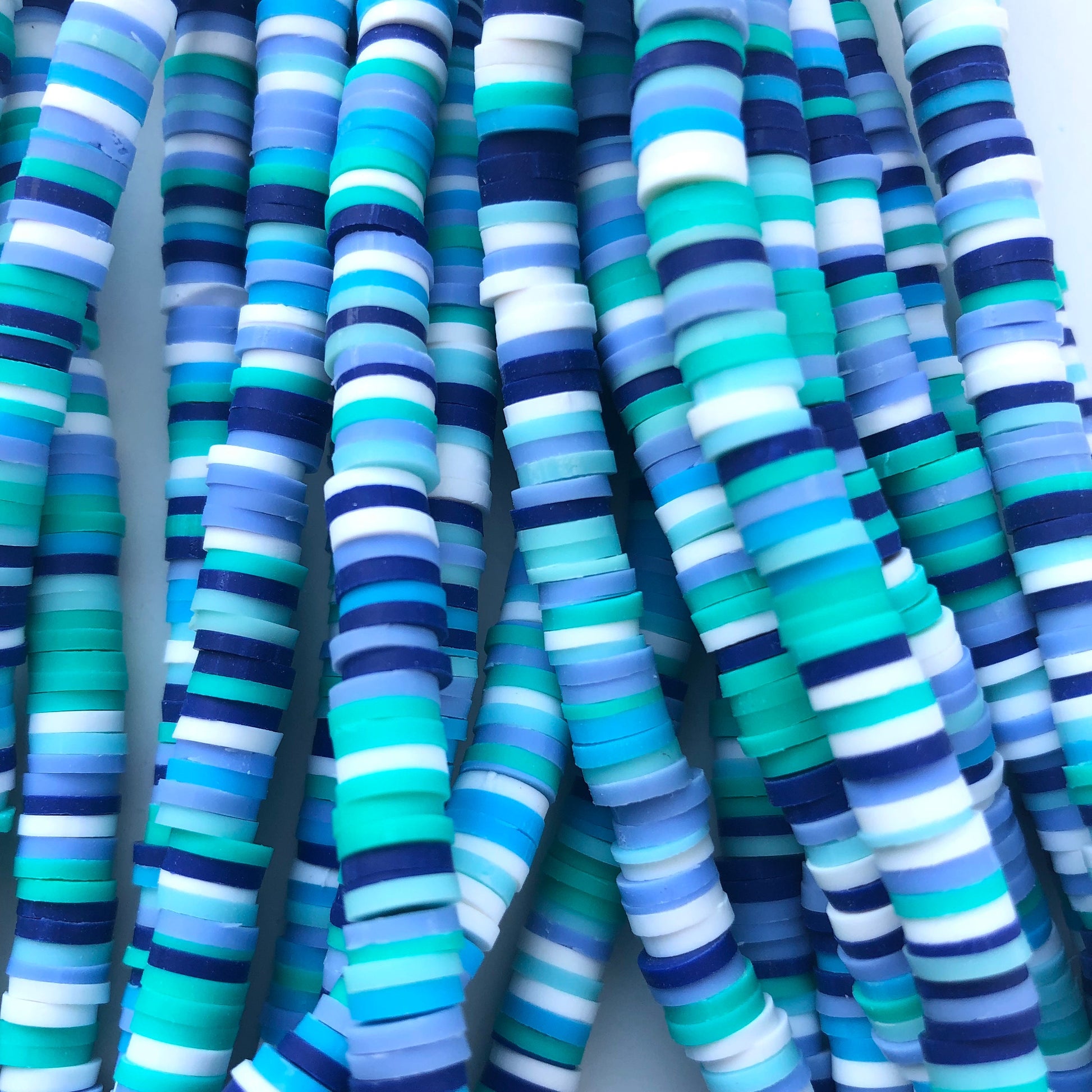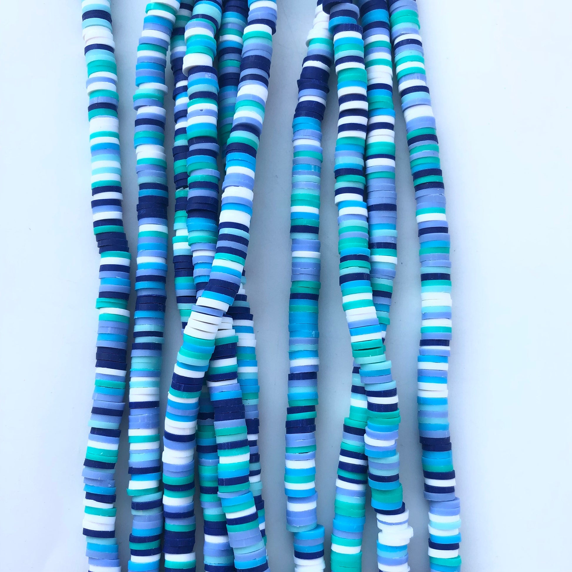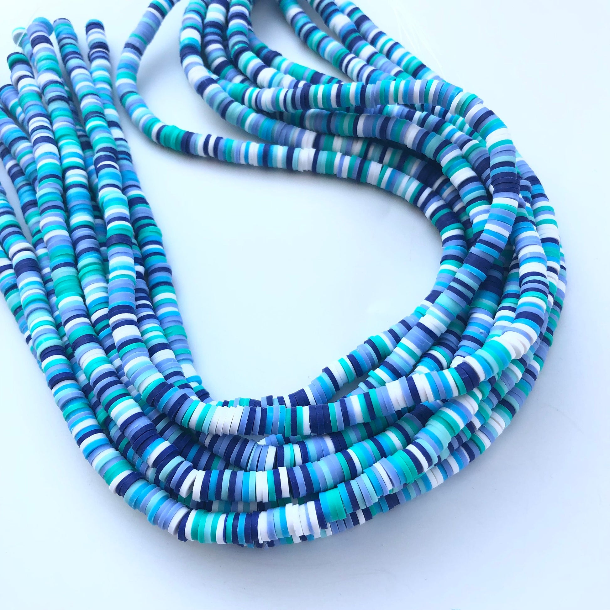 Mixed aqua blue clay polymer beads in disc shape, Katsuki jewellery making beads, ideal for bracelet and necklaces.