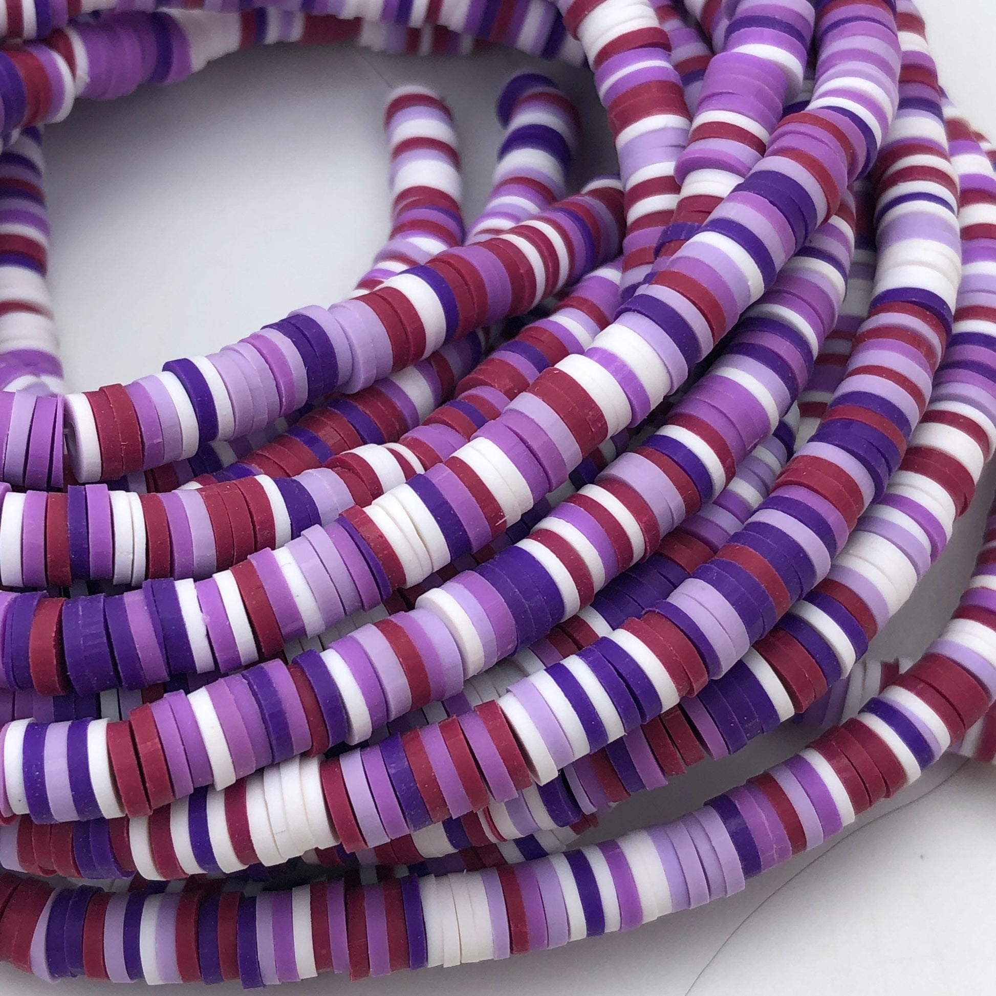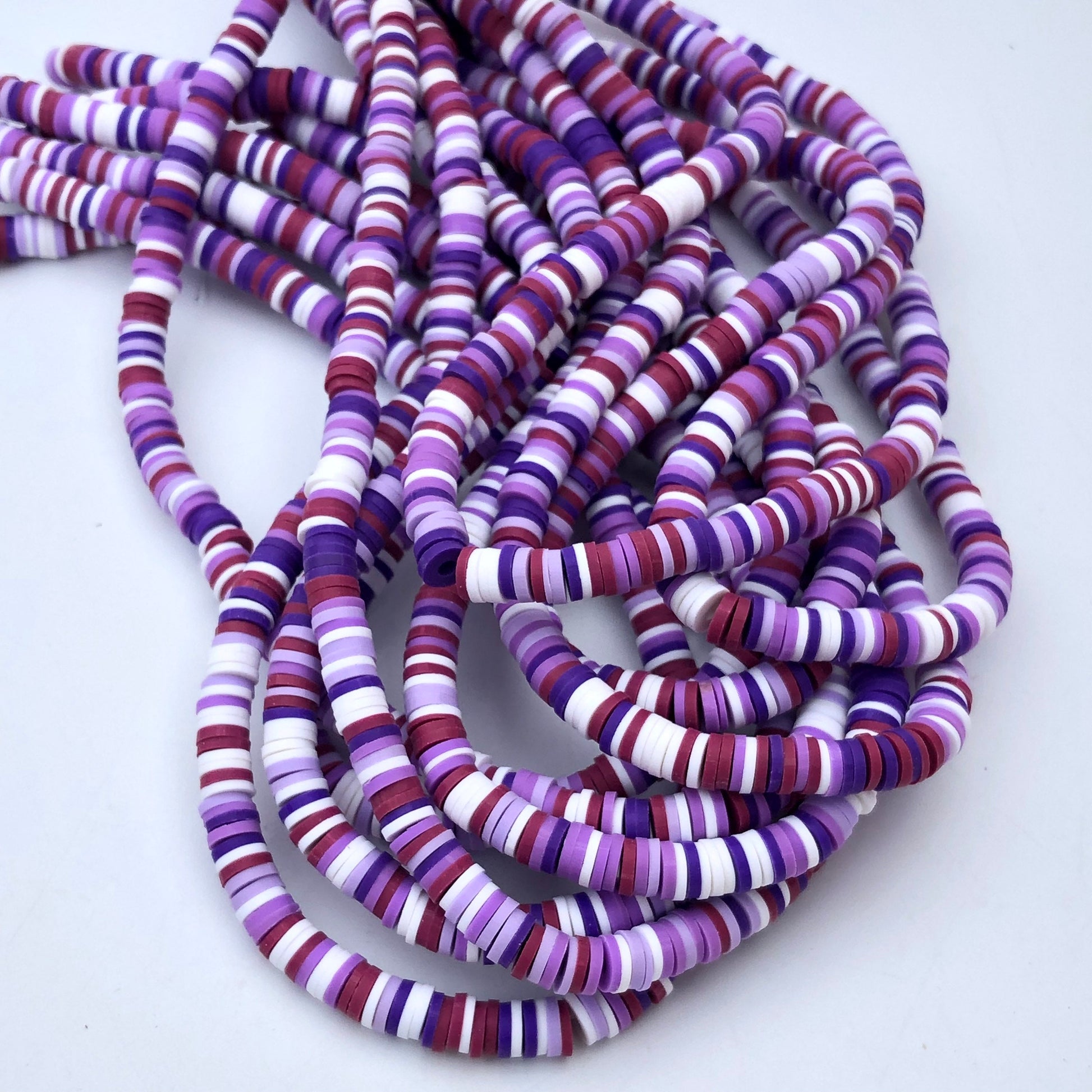A strand of mixed purple coloured katsuki polymer clay beads in a disc donut shape.