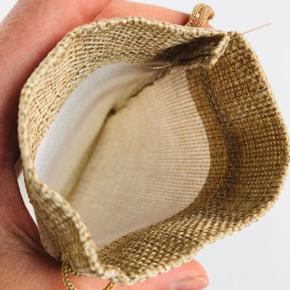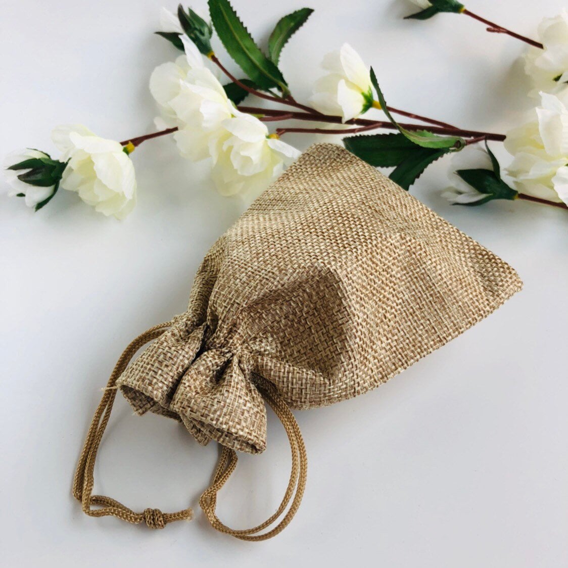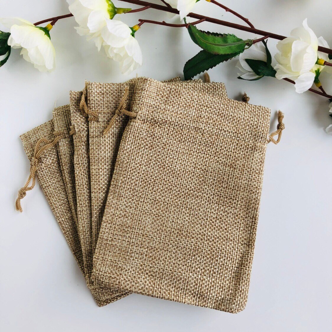 Beige Draw String Pouch, Gift Bag Jute Linen Fabric 13x9cm, 5pcs
