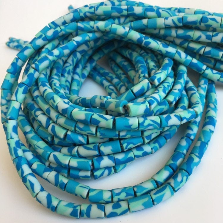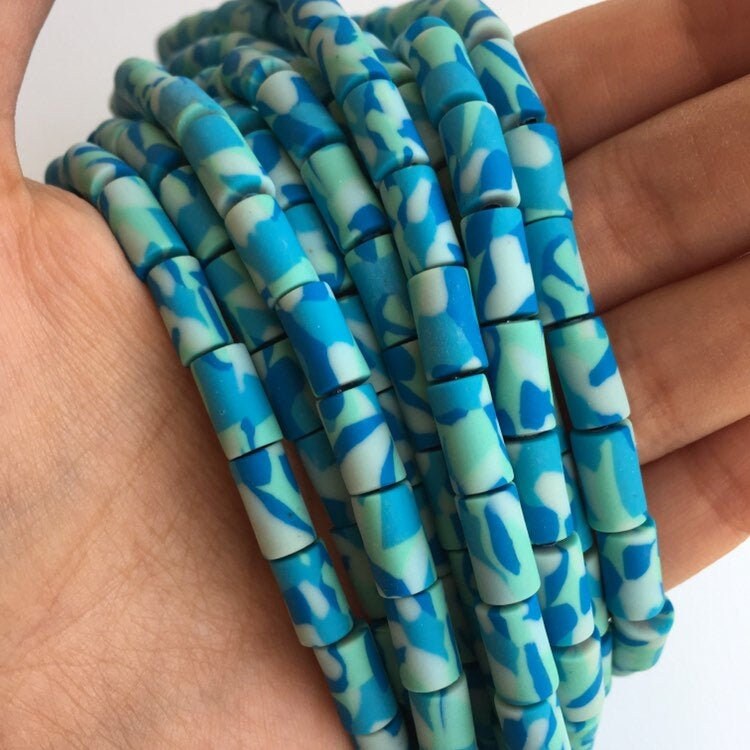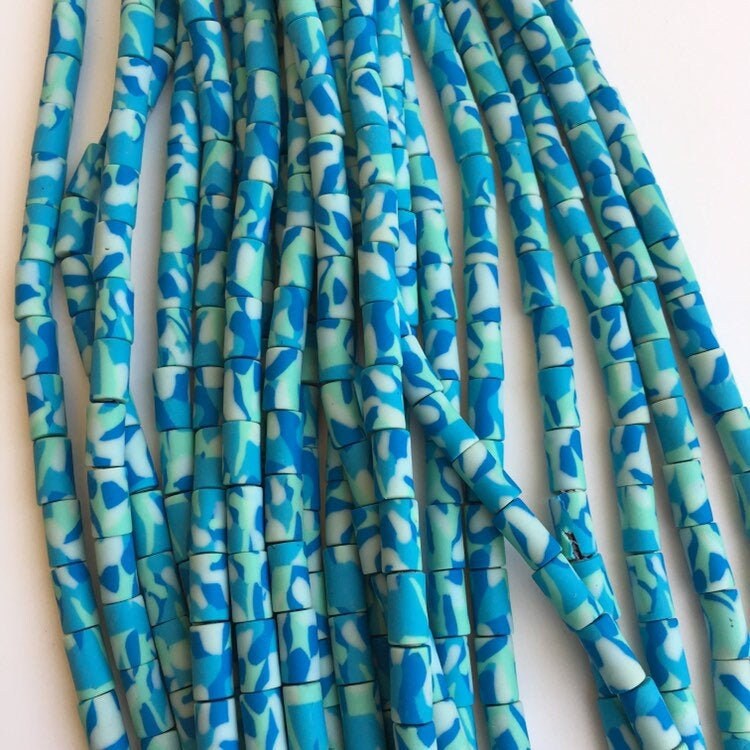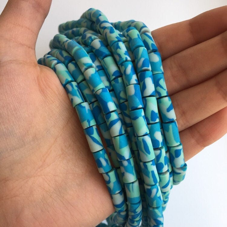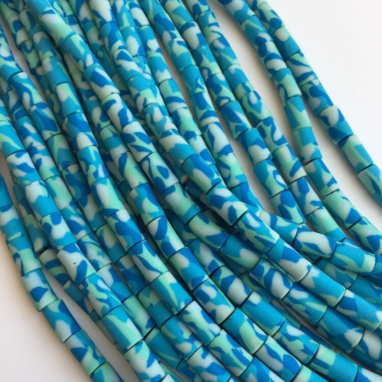 Clay Polymer Beads Blue Winter Army Print Pattern Bead Tube Shape Bead Strand